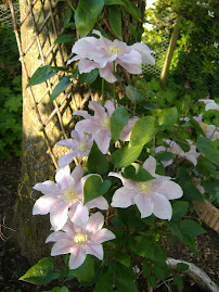 .... er ist ja schon eine Woche da, und die Bäume sind auch grün, aber solch einen Temperatursturz hat er mitgebracht! Während in der letzten Aprilwoche herrlicher Sonnenschein war - bis 26 Grad - und Doris und ich schon im Liegestuhl lagen, kamen mit dem Mai der Regen (der war ja wirklich nötig!), aber bedauerlicherweise auch die Kälte und der Nordwind. Gar nicht schön! Beim Spaziergang und bei der Gartenarbeit ist wieder das Stirnband angesagt. Die Rosen sind nun endlich gedüngt, das wurde höchste Zeit. Doris hat Staudenmohn und die Clematis Mandshurica aus dem Allgäu mitgebracht und meinem Garten geschenkt. Die Clematis ist in einer Woche 20 cm gewachsen, der Mohn trauert noch ein bißchen; wird sich schon noch eingewöhnen. Heute ein neues Tischsträußchen dekoriert: weiße und blaue Waldhyazinthen (heißen wohl auch spanisches Hasenglöckchen und in England Blue Bells), Zweige von der Brautspiere, Wiesenschaumkraut von unterwegs, gelbe Narzissen mit orangenem Herz (die ziemlich letzten), kaukasisches Vergißmeinnicht, Hornveilchen, lila Silbertaler, Mini-Tränendes Herz. Die Kirschbaumblüten wehen wie Schneeflocken vorm Eßzimmerfenster im kalten Wind. Mein Apfelbaum hat sich entschlossen, seine ersten Blüten zu öffnen und meine Clematis Constance zeigt viele rosalila Blütenkelche. Auf unserem Spetzerfehnkanal sind die ersten Entenmütter mit ihrem Nachwuchs unterwegs: 7 und mehr muntere braungelbe Flaumknäuel drängen sich um ihre aufmerksame und besorgt schnatternde Mutter. Paula bleibt jedesmal stehn und überlegt, was das nun wieder Neues ist. Liebe Grüße für heute von: Jutta